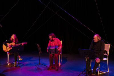 Con tres voces y dos instrumentos musicales, este proyecto colinda con el teatro poético. Ni discos de Canaro articula los lenguajes del bandoneón, la guitarra, la palabra cantada, la palabra dicha y la gestualidad.