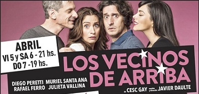 Diego Peretti con Muriel Santa Ana acompañados por Rafael Ferro y Julieta Vallina, protagonizan LOS VECINOS DE ARRIBA, de Cesc Gay, con dirección de Javier Daulte.